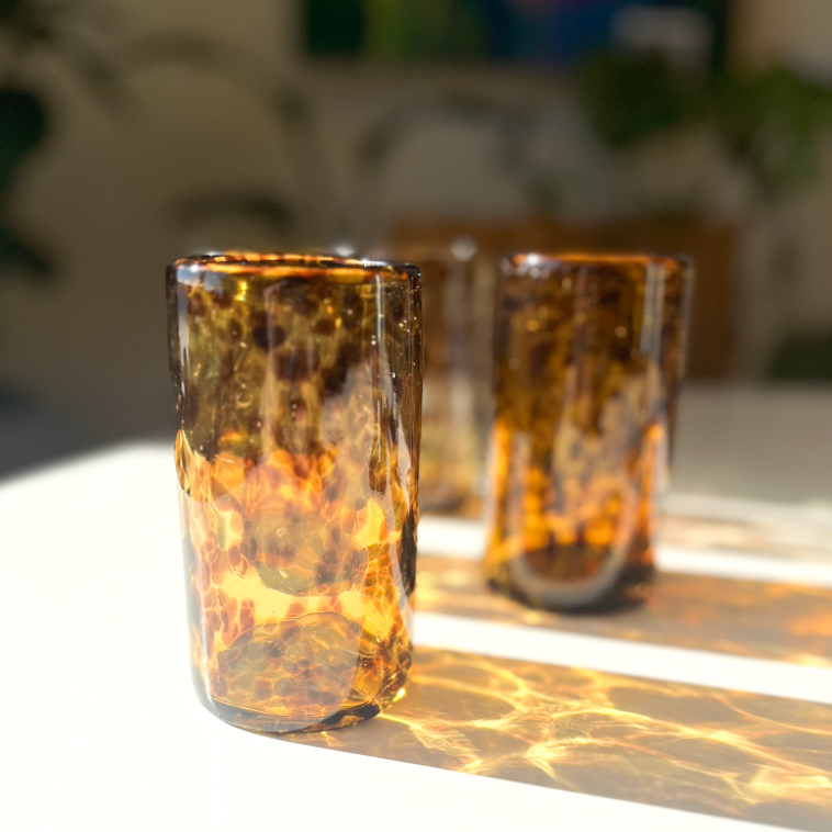 A timeless classic and our favorite animal print. These tall and slender glasses are perfect for daily use. We love rich honey, brown and amber texture on the finish.